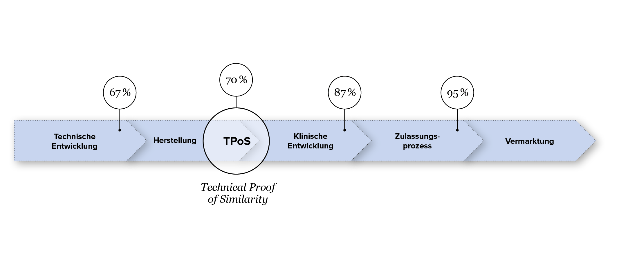 Dadurch fällt das Entwicklungsrisiko gegenüber der Entwicklung eines innovativen biologischen Wirkstoffs deutlich geringer aus. Schon zum Ende der technischen Entwicklungsphase und mit Erreichen des TPoS (Technical Proof of Similarity) liegt die Erfolgswahrscheinlichkeit – also die Wahrscheinlichkeit, dass der Biosimilar-Kandidat die Zulassung durch die Arzneimittelbehörden erhält – bei 70 %.2