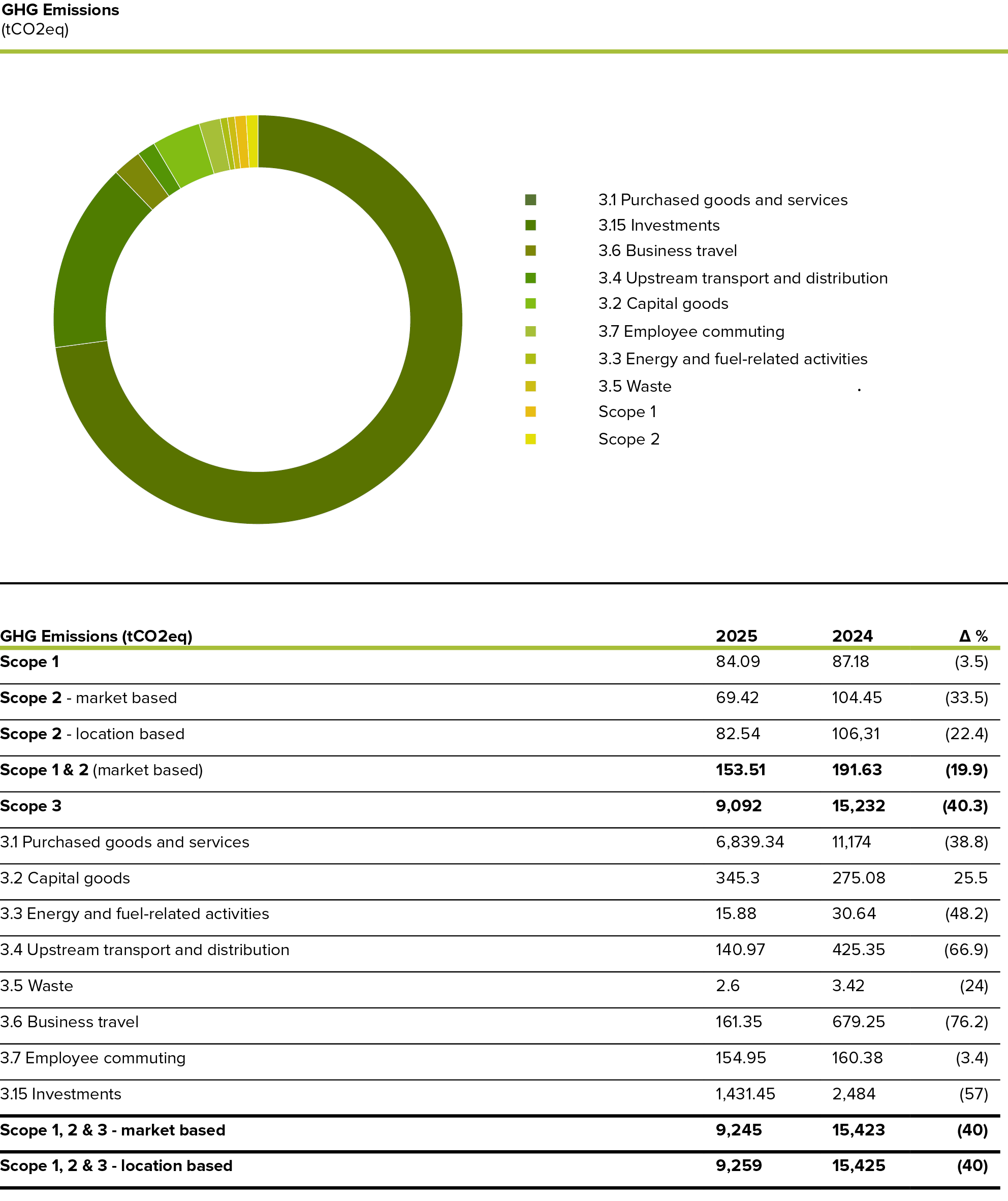 Based on the emissions analysis, we will develop a climate strategy to continue our path to reducing our GHG footprint. In 2024 we explored the possibilities to use electricity from renewable sources and established the goal to switch our electricity consumption to 100% green energy. In 2025, this change was completed and from January 1st in 2026 we source all our electricity from renewable energy sources. We are implementing an Energy management system certified according to ISO 50001, and will expand the certification to include the environmental management system by 2026. We also aim to work together with our strategic business partners on ESG topics along the value chain and are in the process of including sustainability criteria for both existing and new partnerships. An important step in setting binding values for cooperation with our partners was the development of our Supplier Code of Conduct in 2024. The Code is being rolled out among our business partners and will set the framework for responsible cooperation in all our business relationships in the future.