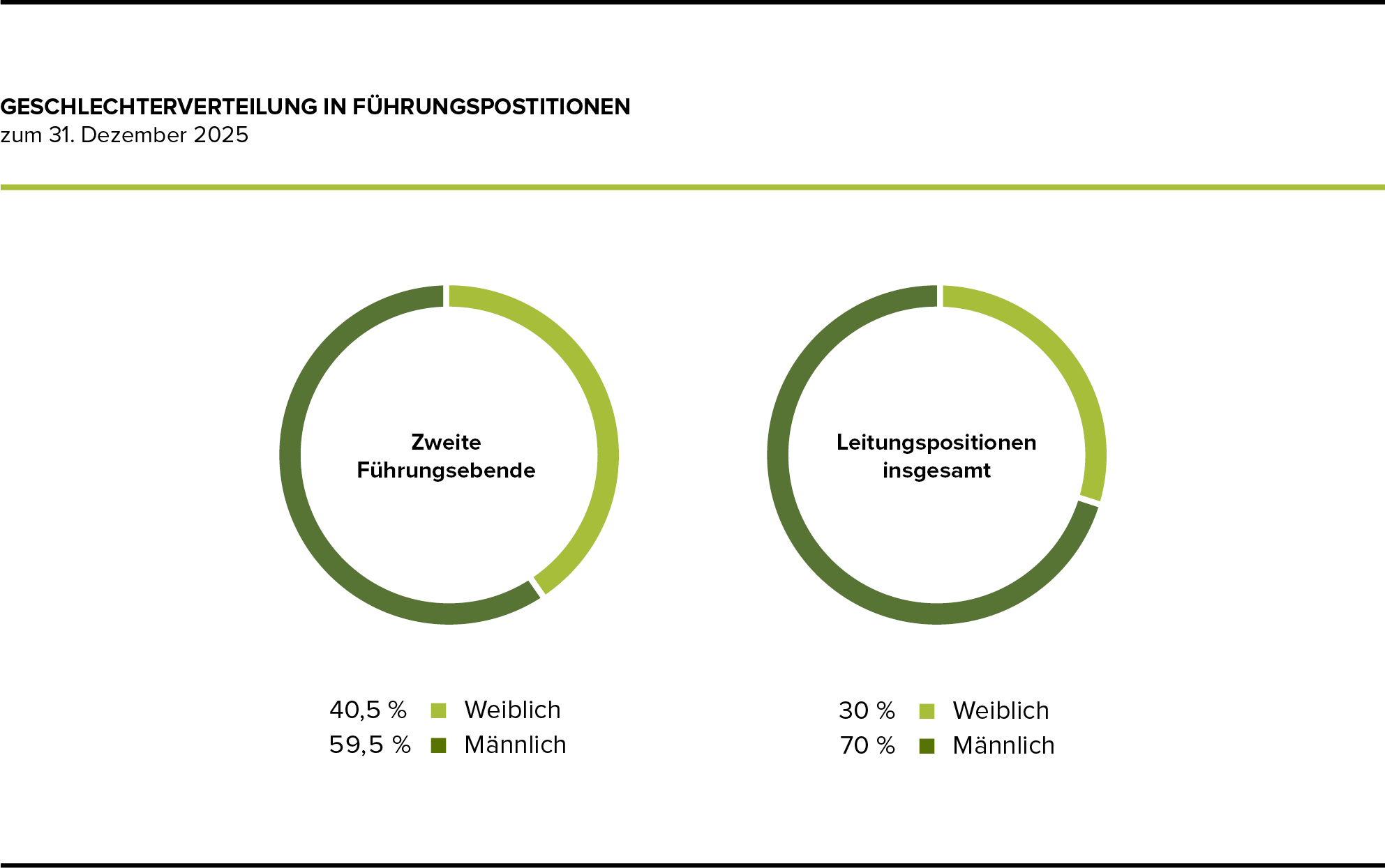 Formycon nimmt das Thema Frauenförderung sehr ernst und strebt an, leitende Funktionen mit weiblichen Führungskräften zu besetzen. Der weibliche Anteil in der zweiten Führungsebene (Vice President, Senior Director, Director und Associate Director) lag zum 31. Dezember 2023 bei 42,9 %. In der höchsten Führungsebene lag der Anteil bei 25%. Insgesamt liegt der Frauenanteil bei Formycon über alle Leitungspositionen hinweg bei 36,2 %.